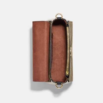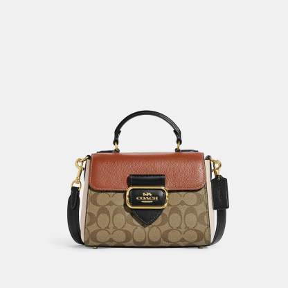 Signature coated canvas refined pebble leather and smooth leather Inside zip and multifunction pockets Snap closure fabric lining Top handle with 2 3/4 drop Outside open pocket Detachable strap with 22 drop for shoulder or crossbody wear Four protective feet at base 8 1/4 (L) x 6 1/4 (H) x 4 1/4 (W) Style No. CE569 | Outlet Morgan Top Handle Satchel In Colorblock Signature Canvas - Beige