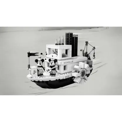 Disney Mickey Mouse fans will love this LEttgGO漏 Ideas 21317 Steamboat Willie building toy marking the 90th anniversary of the most famous cartoon character ever. Mickey Mouse made his screen debut in a 1928 black-and-white animated short film called ?Steamboat Willie', which was also the first Disney film to have synchronized sound. This LEttgGO brick version of the S.S. Willie features steam pipes that move up and down and paddle wheels that rotate when the boat is pushed along. The boat's bridge has room for a minifigure and play-inspiring nautical details such as the ship's wheel, life buoy and buildable bell. On deck there is a working crane to lift the ?potato bin' cargo aboard and this unique toy building set comes with new-for-April-2019 Mickey Mouse and Minnie Mouse minifigures, each with special silver-colored decoration, plus a parrot figure. An ideal LEttgGO set for kids and adults to recreate scenes from the original Mickey Mouse cartoon or simply build and display this striking monochrome model.