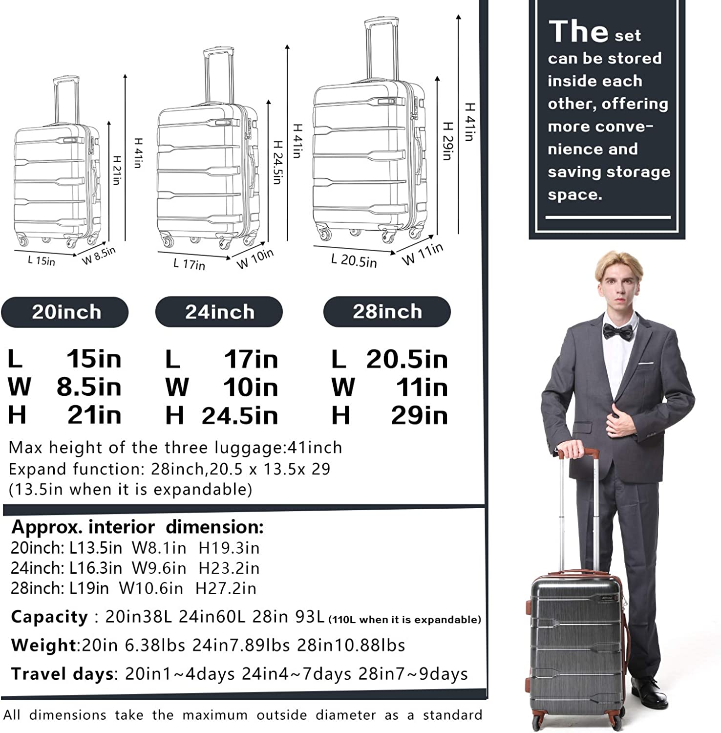 - Three different size: Size: 20inch (21 x 8.5 x 15), 24inch (17 x 10 x 24.5) 28inch (20.5 x 11x 29), Please note that ONLY 28in is Expandable, adding 15%to the scalable space.